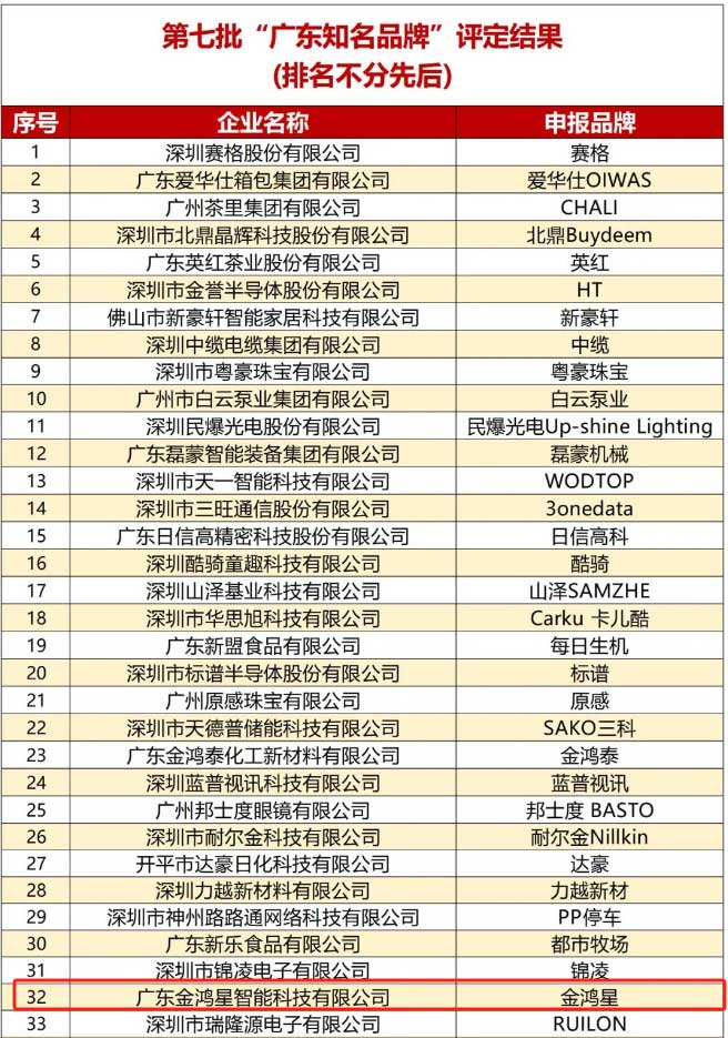2024年1月1日,第七批“廣東知名品牌”名單公布,廣東金鴻星智能科技有限公司憑借獨(dú)特的品牌理念和強(qiáng)大的企業(yè)實(shí)力與客戶認(rèn)知度等綜合實(shí)力,獲得了專家評(píng)委與廣大客戶的高度認(rèn)可,于眾多企業(yè)中脫穎而出,斬獲“廣東知名品牌”殊榮。