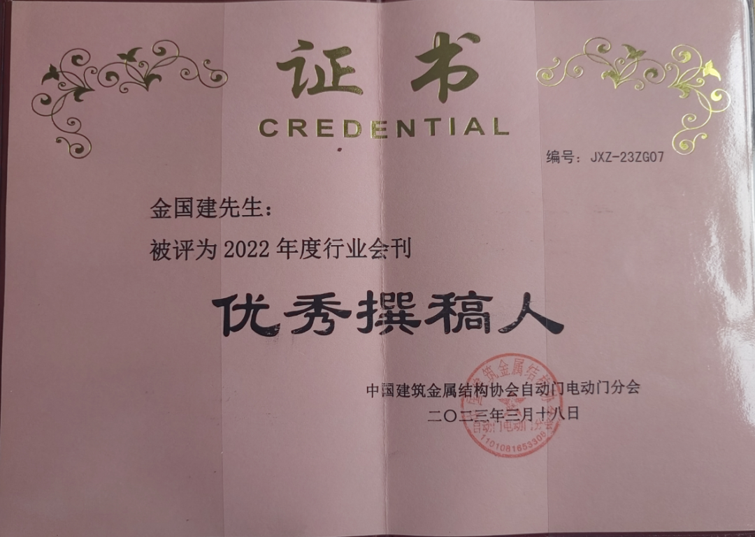 盛典現(xiàn)場,廣東金鴻星智能科技有限公司董事長金國建先生被聘為中國建筑金屬結(jié)構(gòu)協(xié)會技術(shù)顧問并斬獲多項殊榮,其中獲評「2022年度自動門電動門分會優(yōu)秀副會長」、「戶外人行智能平開門參編單位」、「自動門電動門行業(yè)特別奉獻獎」,金鴻星董事長金國建榮膺「2022年度行業(yè)會刊優(yōu)秀撰稿人」稱號,這些殊榮充分肯定了金鴻星在中國自動門電動門行業(yè)的卓越地位及深厚影響力。