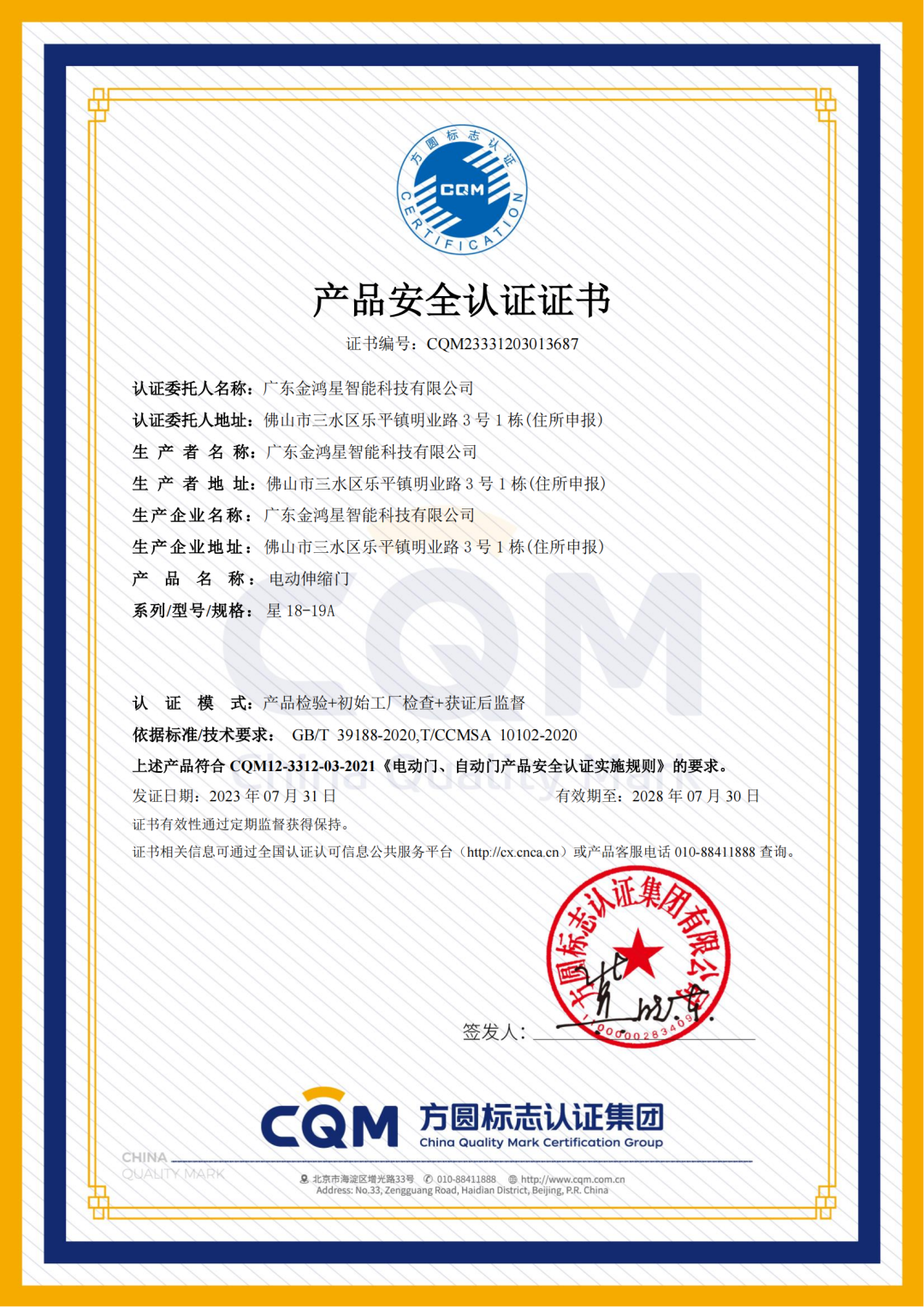 電動門安全問題一直是備受大眾矚目,隨著門的品類的延伸及相關技術標準的完善,原產品認證覆蓋的范圍已不能滿足市場需求,因此,方圓標志認證集團聯(lián)合中國建筑金屬結構協(xié)會自動門電動門分會依據(jù)GB/T 39188-2020,T/CCMSA 10102-2020技術標準及要求,制定了CQM12-3312-03-2021《電動門、自動門產品安全認證實施規(guī)則》,以更嚴苛的安全標準、更嚴謹?shù)恼J證規(guī)則,確保電動門產品的認證更規(guī)范。